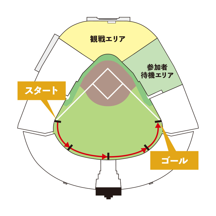 小学生以上の4人を1チームとし、外野人工芝部分のライトホームランポールからレフトホームランポールまでの間で行うリレー走です。1人当たり約50mのコースを走ります。- ※小学生未満のお子さまは参加不可。18歳未満の参加は必ず保護者(18歳以上)の同意が必要です。