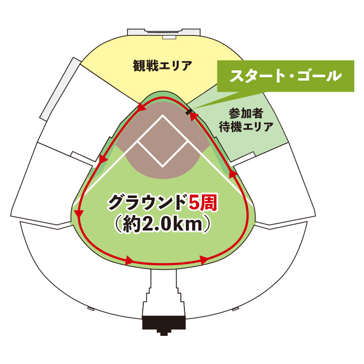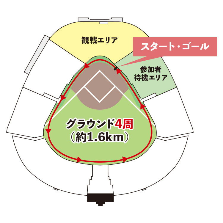 小学生以上の4人を1チームとし、外野人工芝部分のライトホームランポールからレフトホームランポールまでの間で行うリレー走です。1人当たり約50mのコースを走ります。- ※小学生未満のお子さまは参加不可。18歳未満の参加は必ず保護者(18歳以上)の同意が必要です。