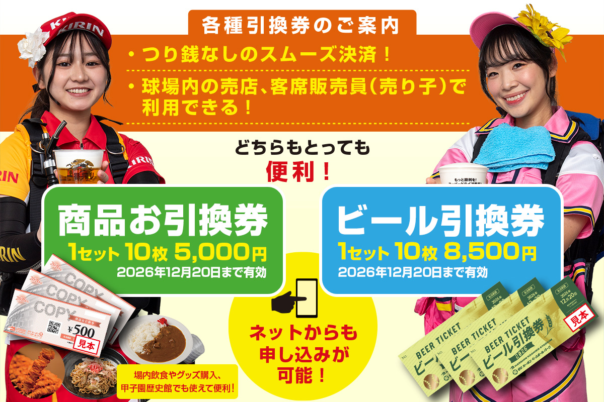 - ●阪神甲子園球場及び日鉄鋼板 SGLスタジアム 尼崎の店舗、客席販売員(売り子)及び甲子園歴史館並びにチームショップアルプス、ファンショップダグアウトにてご利用になれます(但し、店舗営業時以外並びに入場券のご購入、及び一部の外周販売店テント等ではご利用できませんのでご了承ください)。